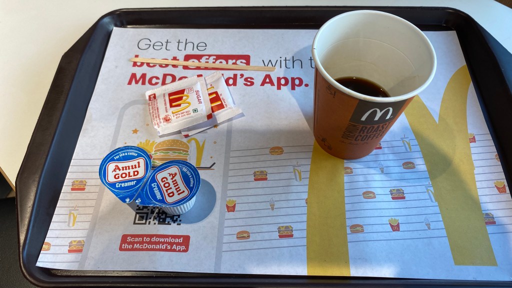Who says only CCD or Starbucks only can serve the best coffee. I mean, yes! they are the masters in the world of coffee but Mc Donald’s has also started serving coffee that very well matches the taste buds of elders or people in the age group between 30-50. They serve the brewed coffee with two milk sachets by Amul and pouches of sugar- as per your need along with an eco-friendly stirrer. It is nice to see, they genuinely are putting efforts in satisfying the customer needs. It was very English style of serving the coffee. I liked it!